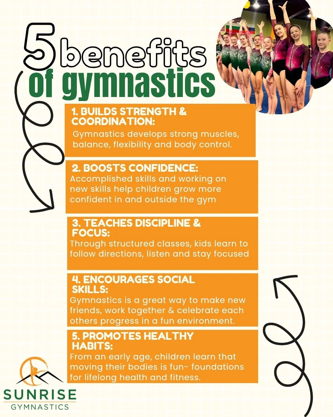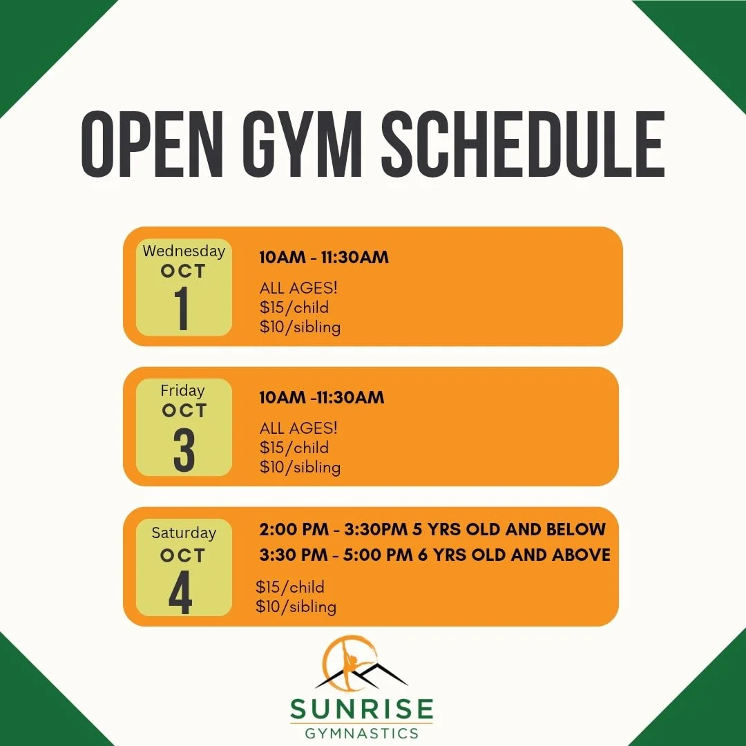 we would like to continue with sunrise gymnasticsβ success by offering quality programs and providing children with vibrant & positive environment.